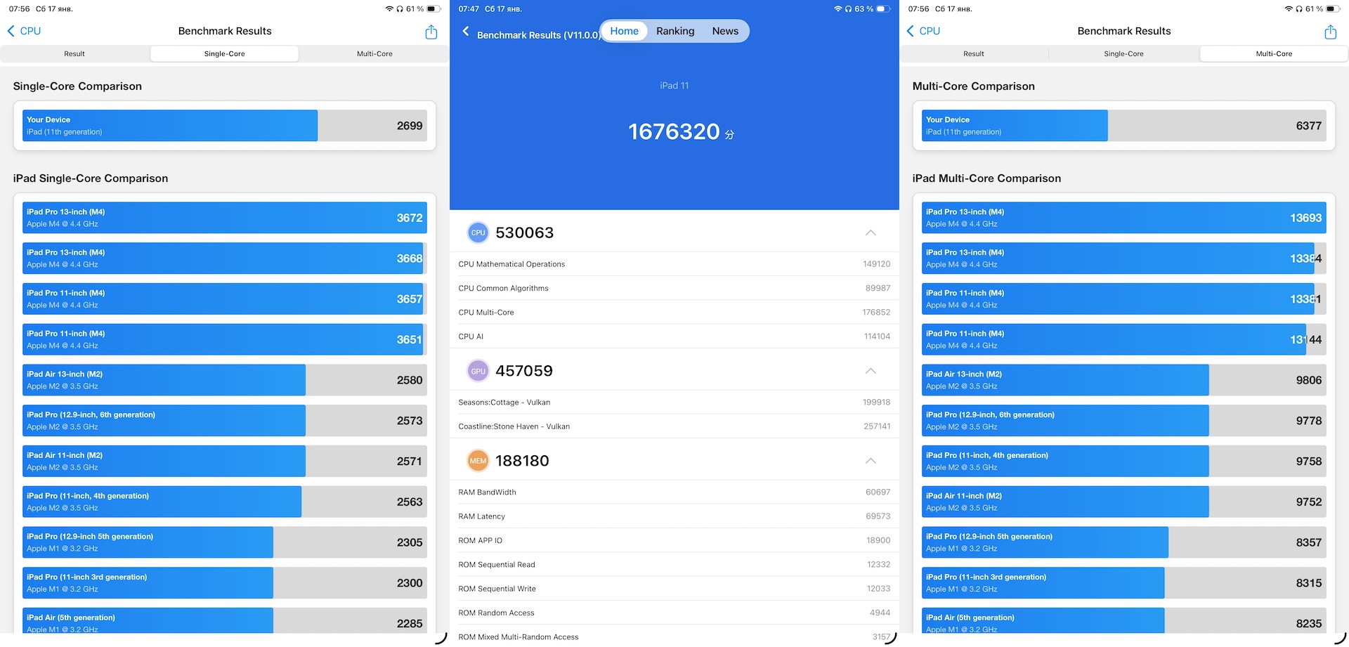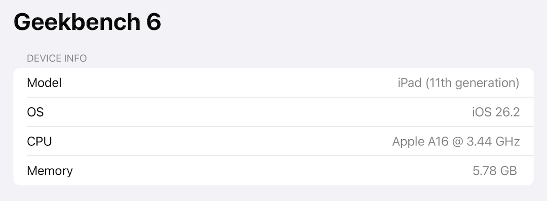 Под капотом базового iPad 5-ядерный процессор Apple A16 Bionic, 6 Гб оперативной и 128/ 256/ 512 Гб — флеш-памяти на выбор. Этой мощности всецело хватает для большинства повседневных задач — потребление контента, серфинг в интернете, созвоны (особенно с фронтальной камерой на длинной стороне устройства), игры на приемлемых настройках, а тесты «в попугаях» мы приведём скриншотами.