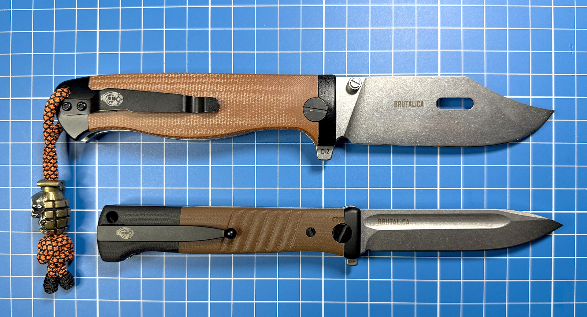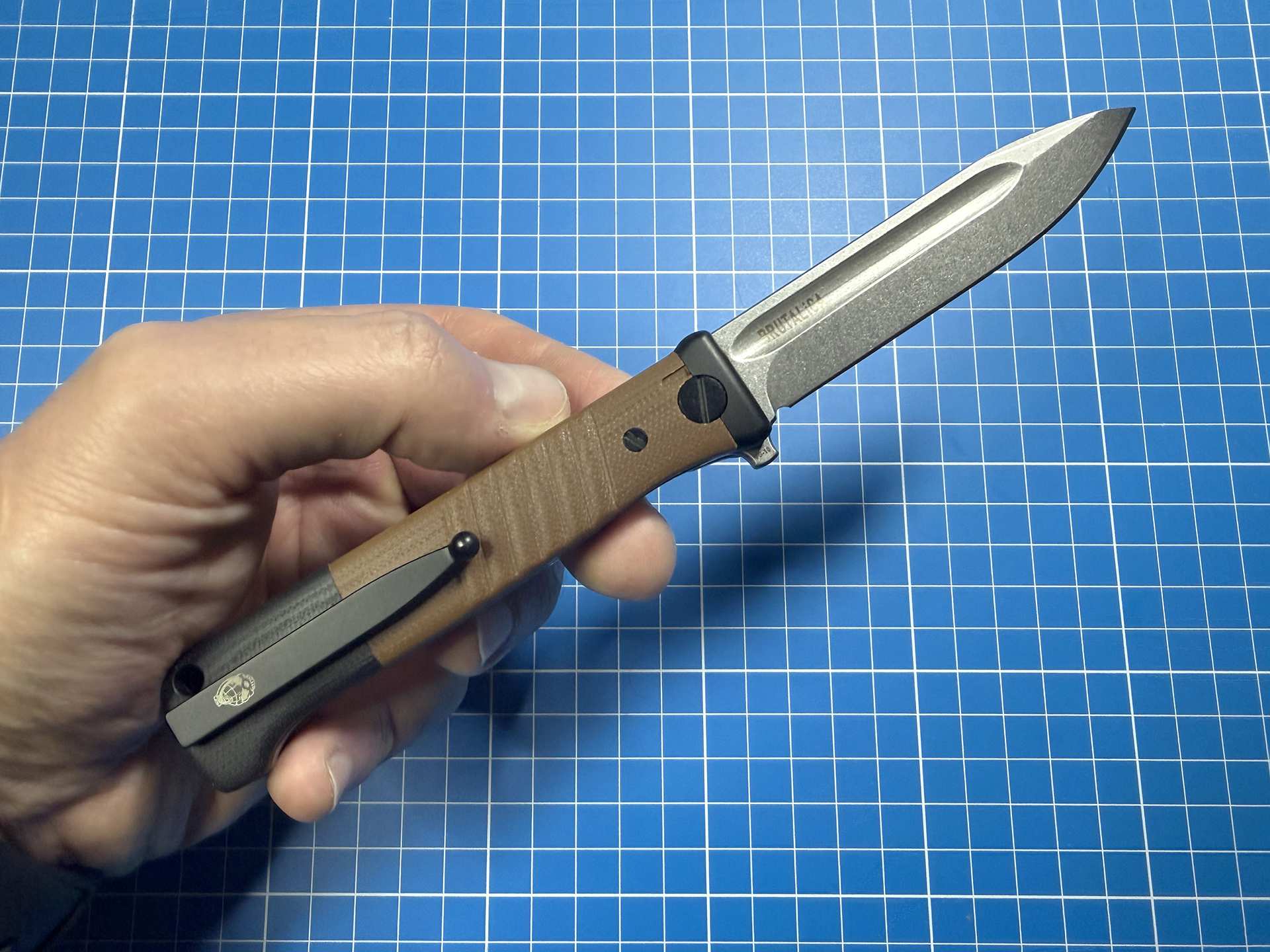 Структура Brutalica K-98 классическая: мощные лайнеры, прикрытые составной рукоятью с темлячным отверстием скрывают в себе широкий клинок, разделены осевым механизмом с керамическим подшипником и надёжным бэкспейсером, а довершает картину не переставляемая стальная клипса, которая повторяет изгибы линий ножен штык-ножа прототипа — Маузера. Сборка конструкции прекрасная — здесь даже не к чему придраться.