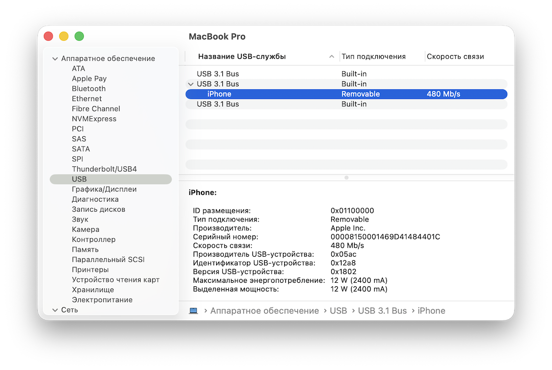 Длина кабеля заявлена в 16 см, но за счёт крепления в «сердечнике» и изгибов фиксации он смотрится несколько короче. Штекеры USB-C литые, выглядят надёжными: провод поддерживает Fast Charge, до 65 Вт и передачу данных до 480 Мбит/с (что подтверждает скриншот из интерфейса MacOS) ☺️