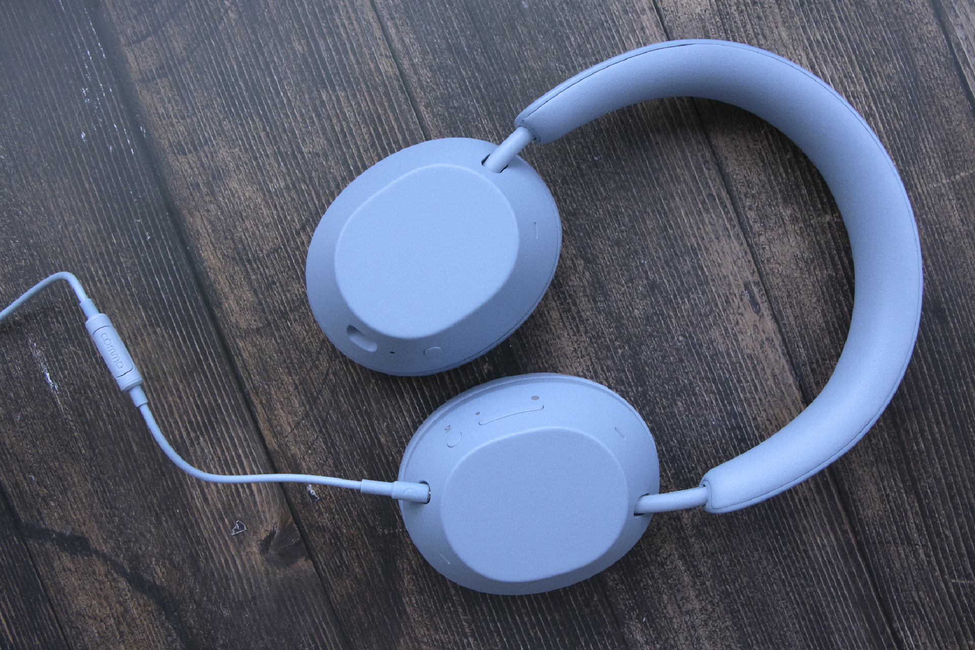 На верхней скошенной грани чашек видны вырезы микрофонов, управление рассредоточено по боковым частям. На правой чашке — качелька регулировки громкости и кнопка воспроизведения-паузы, по двойному-тройному нажатию перематывающая треки, а по долгому переключающая режимы звучания, на нижней стороне установлен гнездо под 3.5 мм джек, с четырьмя контактами внутри для подключения штатного кабеля с микрофоном. На левой грани из кнопок есть только включение-выключение, а чуть ниже неё разместились светодиод и разъём USB-С.