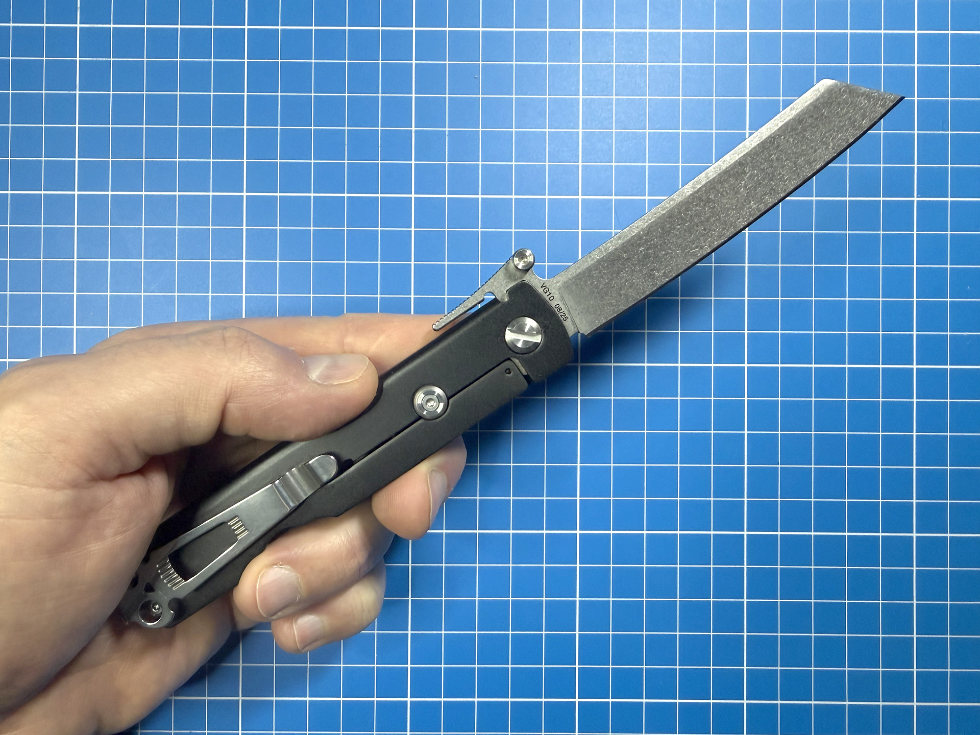Клинок длиной 88 мм выполнен из стали VG10 твёрдостью 58-60 единиц по Роквеллу, а обработка, в зависимости от модели, может быть Stonewash, либо Blackwash. Форма — реверс танто или «хвост», поддерживает дух классического Хигоноками.