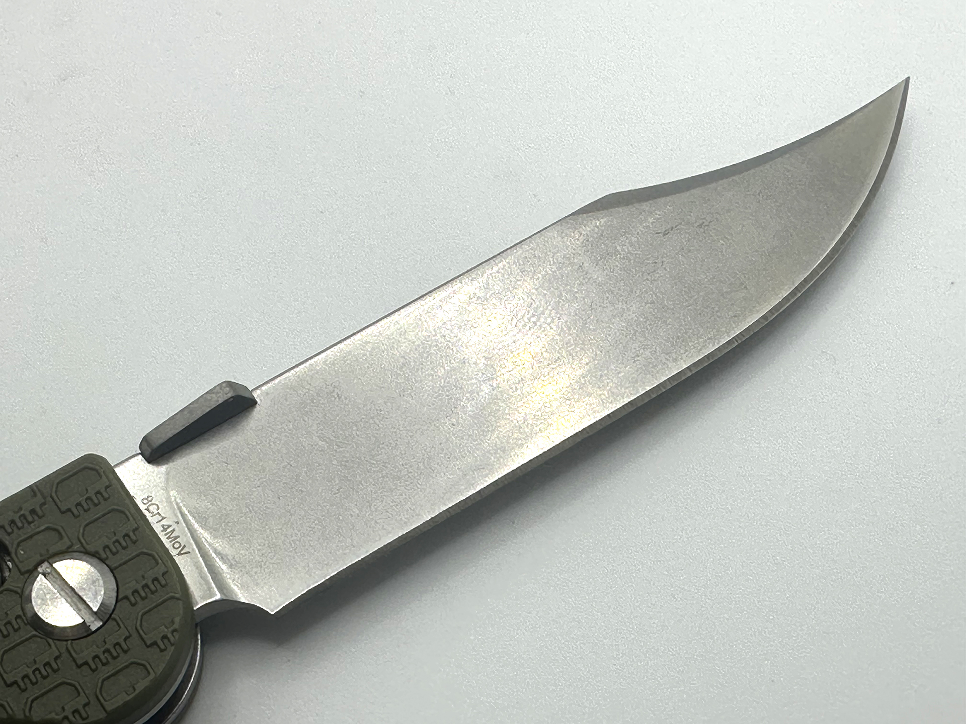 Клинок ножа формы bowie: классическая «щучка» умеренной ширины и длиной ровно 100 мм. В обухе мы имеем 3,2мм, а сталь — привычная для линейки 8Cr14MoV с твёрдостью 57-58 единиц по Роквеллу В нашем варианте была обработка stonewash, но имеются также и blackwash- клинки, на выбор. Необычность новой серии в линейке — это плоский шпенёк, расположенный ближе к основанию лезвия: «нашлёпка» служит как для открытия ножа, так и упором — на неё удобно положить большой палец при резе. Форма аксессуара нестандартная — перед нами сложный многоугольник, который крепится к обуху на torx-винт.