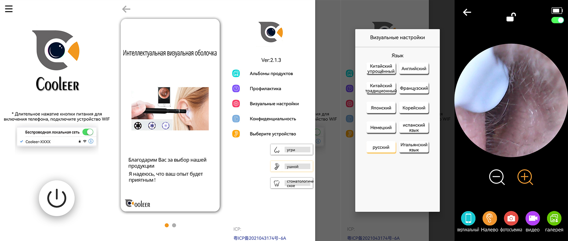 Для того, чтобы в принципе видеть происходящее и понимать, где нужно чистить, вам потребуется приложение, называющееся почему-то Cooleer. Вероятно, оно универсальное и предназначено для многих похожих гаджетов от разных китайских брендов. Сначала вам предложат подключиться к локальной сети Wi-Fi с именем типа Cooleer-12345х, раздаваемой гаджетом. Далее, прочитав пару экранов с благодарностями, вы попадёте в основное меню, где можно выбрать тип гаджета (нам нужен «ушной»), посмотреть альбом или зайти в «визуальные настройки», являющиеся на самом деле выбором языка. Ну а сам интерфейс отоскопа — круглое окошко камеры и кнопки записи фото, видео, перехода в галерею, инверсии по горизонтали, а также смены ориентации экрана.