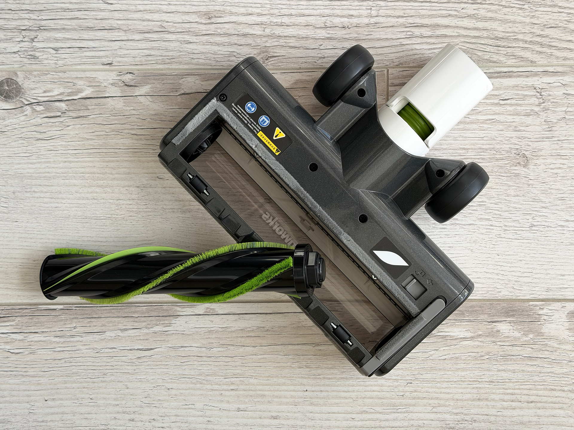 В турбощётке используется собственный умный двигатель с ремённым приводом щёточного ролика, а сам ролик имеет три типами щетины (жёсткая, мягкая и эластичная) для качественной уборки различных поверхностей — ковры/ ковролин, а также плитка, керамогранит, ламинат, линолеум и тому подобные. На нижней панели щётки присутствует фиксатор, позволяющий снять элемент и промыть его под проточной водой без очистки всего модуля, а после его извлечения мы можем видеть гребенчатые зубцы для защиты от спутывания волос на ролике.