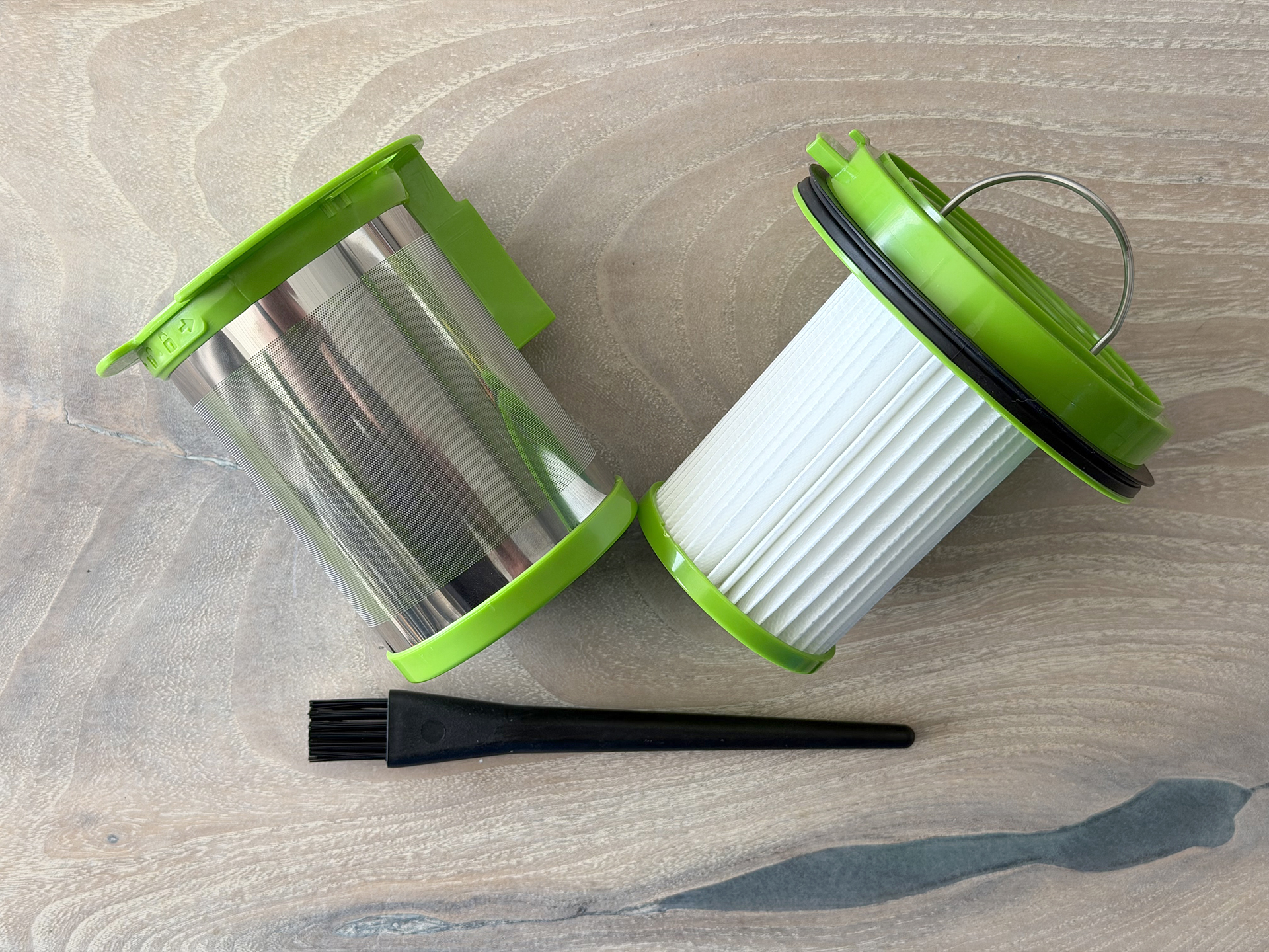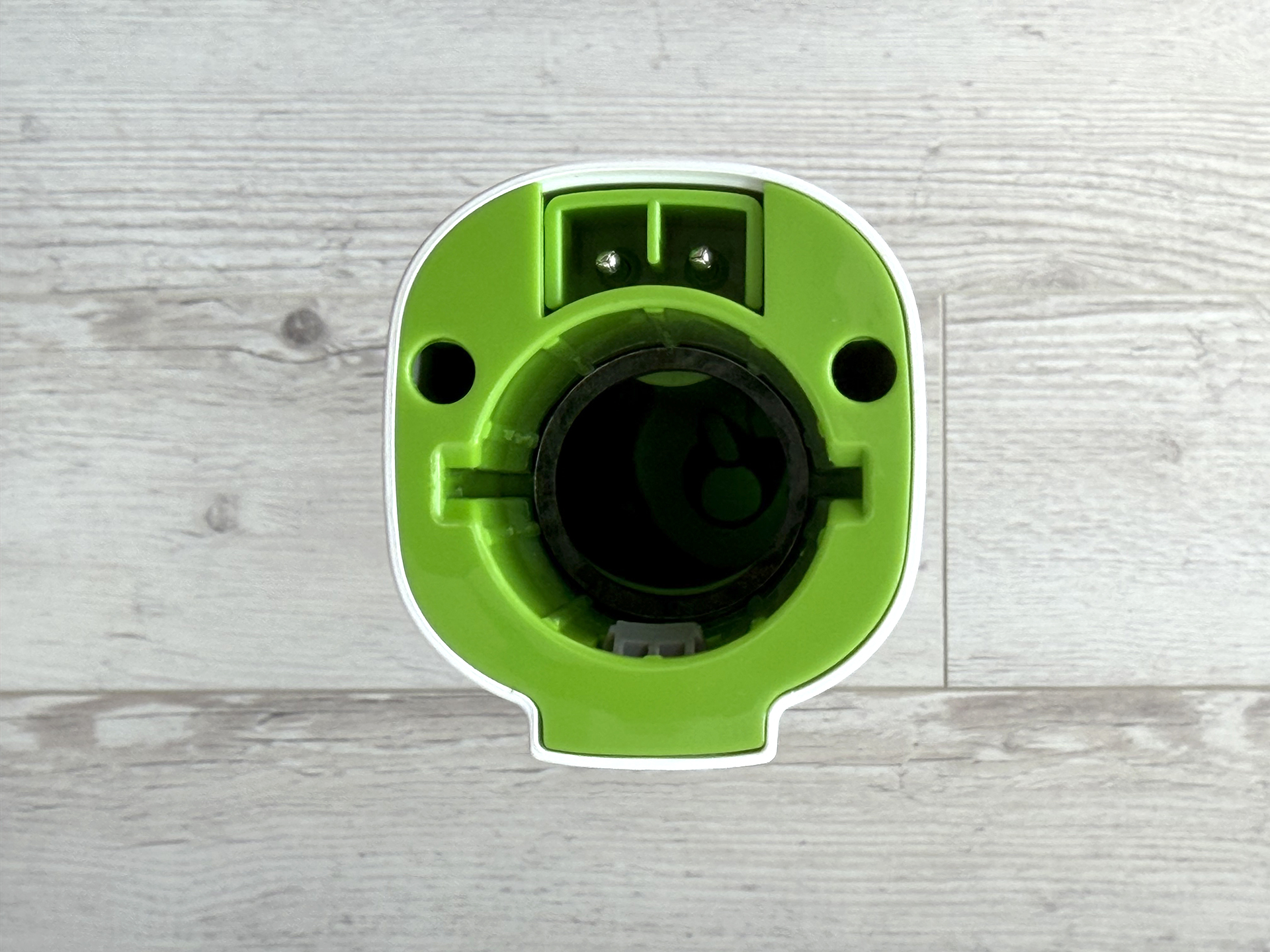 Задник с фактурным логотипом Greenworks на двух бортах имеет сопла воздуховодов, к нему крепится резервуар для пыли, объёмом 0,5 л с крышкой сброса в нижней части, а внутри мы видим металлический цилиндр из нержавеющей стали предфильтра, в который установлен основной фильтр пылесоса — элемент тонкой очистки HEPA13, обеспечивающий фильтрацию до 99,95% частиц размером 0,3 микрона.