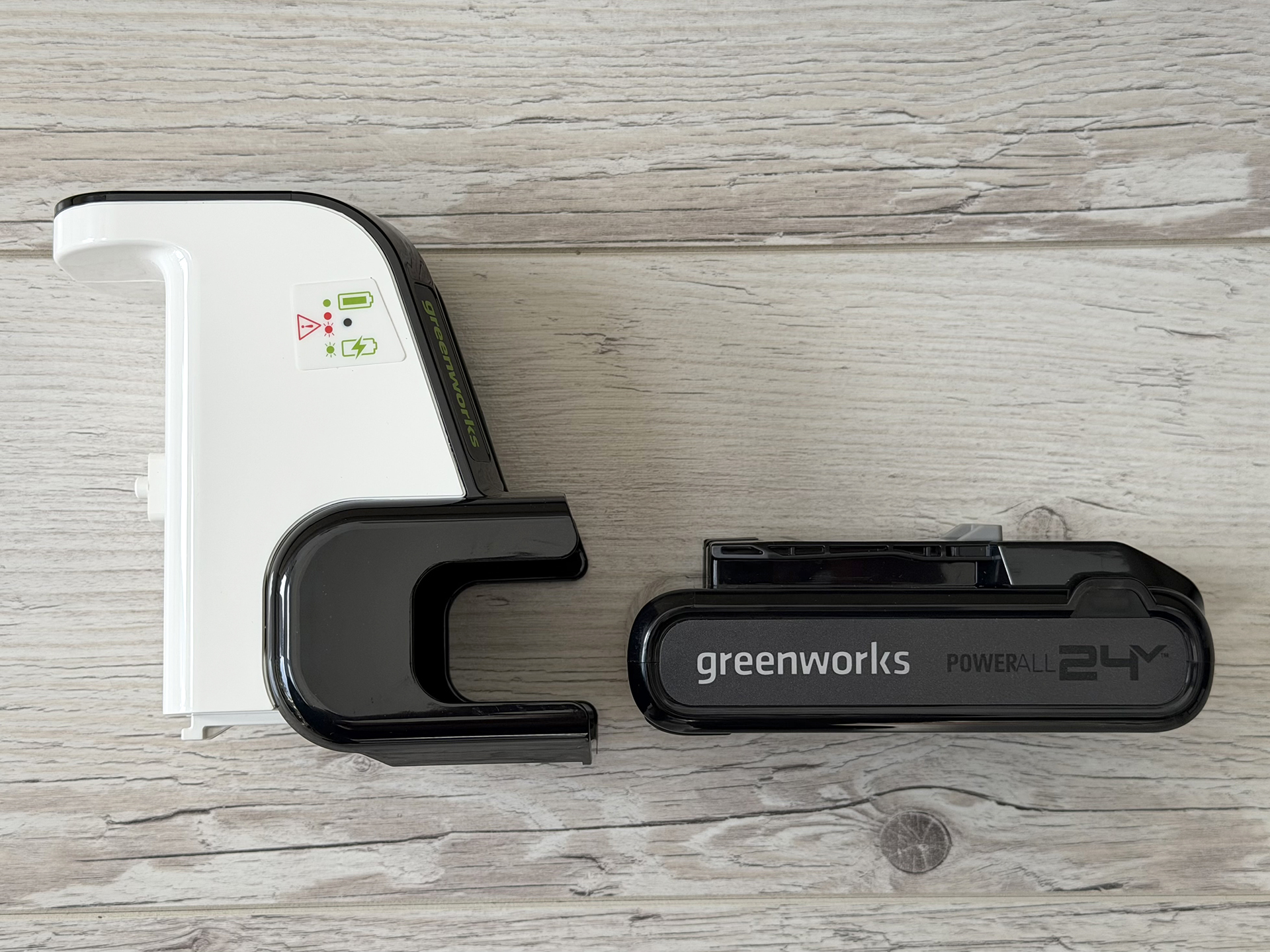 Подготовка Greenworks SV24360 к работе весьма простая: необходимо собрать конструкцию, установить её в кредл, зарядить АКБ и можно приступить к чистке поверхностей. Определяемся с типом уборки и характером воздействия, для чего подбираем насадку и мощность — для твёрдых и мягких покрытий используются разные режимы.