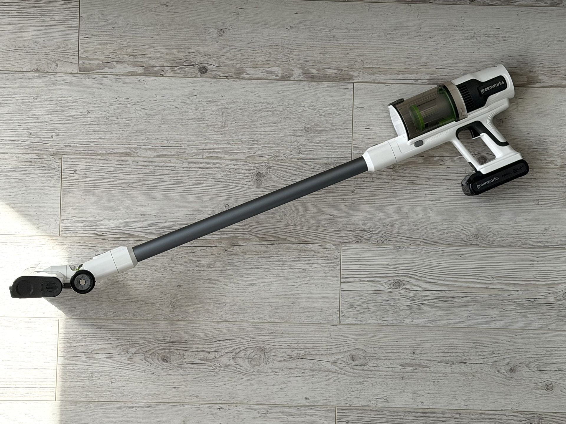 Внешний вид Greenworks SV24360 в целом привычный для вертикальных пылесосов, хотя свои особенности и детали у него всё же есть. Доминанта конструкции, рукоять — в ней прячется бесщёточный двигатель DIGIPROT и сенсорный дисплей управления. Пистолетный тип с крупным курком серого пластика и его обрамления, хотя основной цвет корпуса — молочной белый, глянцевый, практически не притягивающий пыль в процессе работы.