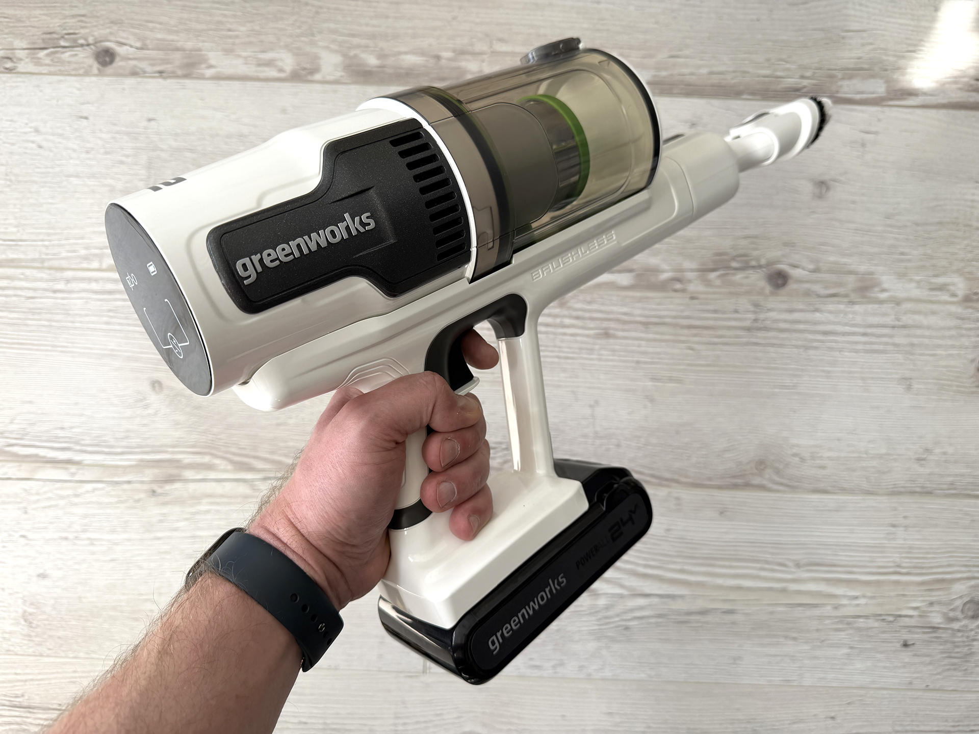 Greenworks SV24360 показывает прекрасные результаты как на ковре с высоким ворсом, на деревянном полу и плитке, так и на более мелких поверхностях, таких как щели дивана, жалюзи и даже клавиатура ноутбука. Пылесос стартует со «среднего» режима — нормального и позволяет менять его в процессе работы, сообщая о своём статусе в случае перегрева, переполнения резервуара, индикаторами. Фишка с включением турбо после финального нажатия на курок работает прекрасно и вокруг убираемой поверхности не остаются остатки пыли.