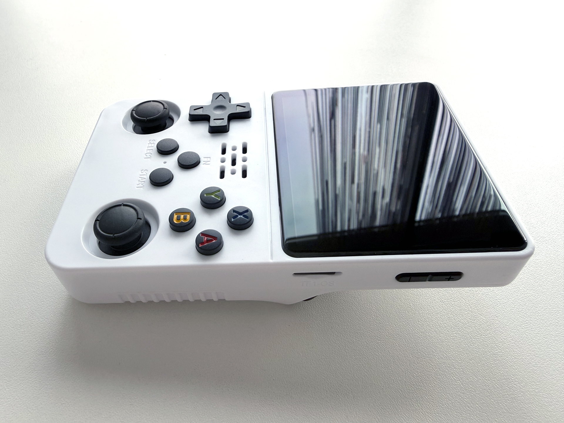 Верхний торец корпуса R36S лишён элементов, а на правый вынесена небольшая качель громкости и слот для microSD с системой и играми. Левая боковина вместила кнопки блокировки/ питания, reset и второй слот для карты памяти (расширение комплектных ROM-ов игр, если понадобится).