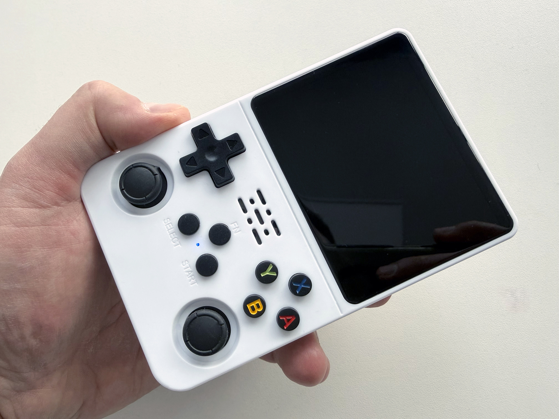 Визуально R36S напоминает сильно прокаченный Game Boy: вытянутый брусок корпуса белого (как в нашем случае) или прозрачного пластика различных оттенков с закруглёнными углами. Материалы исполнения консоли добротные, но явно недорогие, а сборка достойная, однако клавиши при встряске вибрируют и создают ощущение расхлябанности конструкции.