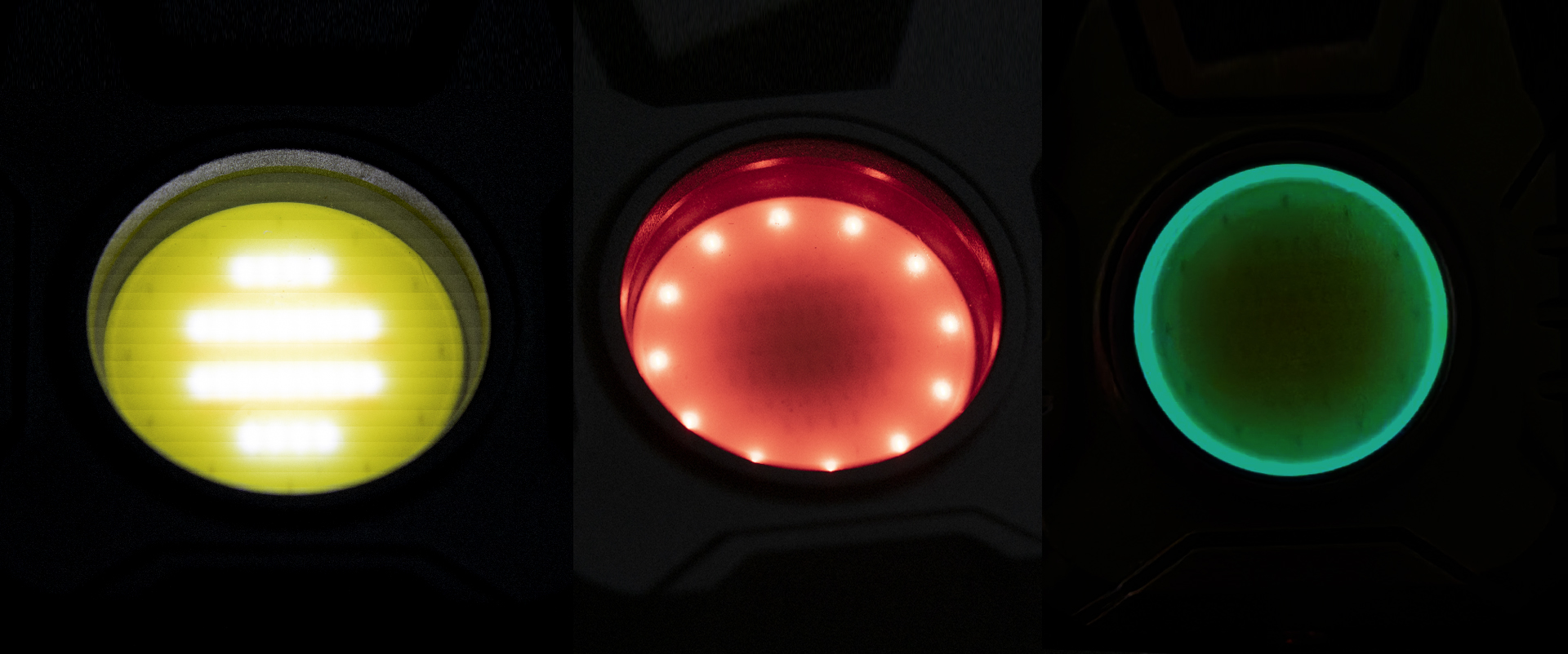 Всё управляется двумя кнопками — питанием и выбором цвета. Короткое нажатие на питание включает фонарик в режим обычного света на четверть мощности, следующие нажатия последовательно переключают его на среднюю мощность и максимальную мощность, после чего идёт включение красного света (светодиоды располагаются по кругу) и моргающего красного света. Следующее нажатие отключает фонарик. Если в одном из режимов обычного света нажать на кнопку питания и держать, включится сверхяркий режим — он действует не более минуты, после чего отключается из-за перегрева. И да, если фонарик работает в любом режиме больше десяти секунд, нажатие на питание приводит к полному отключению. Почему так? Загадка!