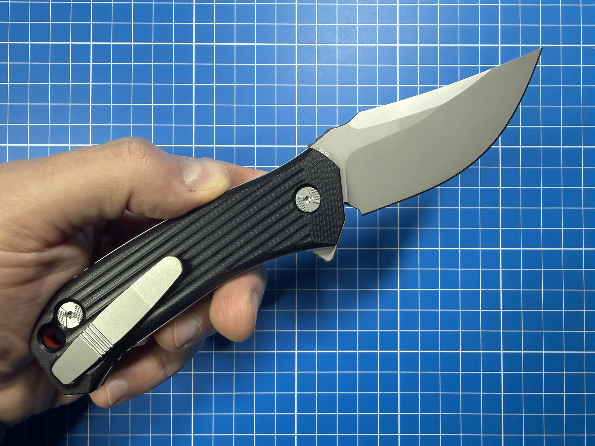 Структура ножа привычная: облегчнённые стальные лайнеры покрыты чёрным стеклотекстолитом G10 с продольными рифлёными насечками, подчёркивающими направленность и призыв к действию, бэкспейсер яркий, красный, а клинок необычной формы — так называемый upswept-point.