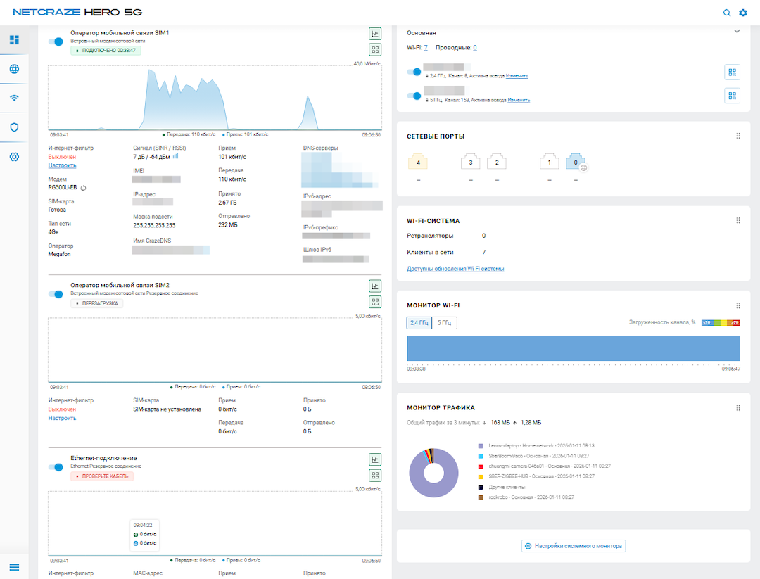 Статус содержит агрегированные данные обо всех подключениях в формате дашбордов: скорость интернета, имена/доступность домашней и гостевых (или дополнительно созданных) сетей, статус портов, монитор Wi-Fi и трафика, сведения о системе. Для мониторинга трафика также используются две отдельных подпункта, которые позволяют отслеживать текущее состояние и загруженность каналов.