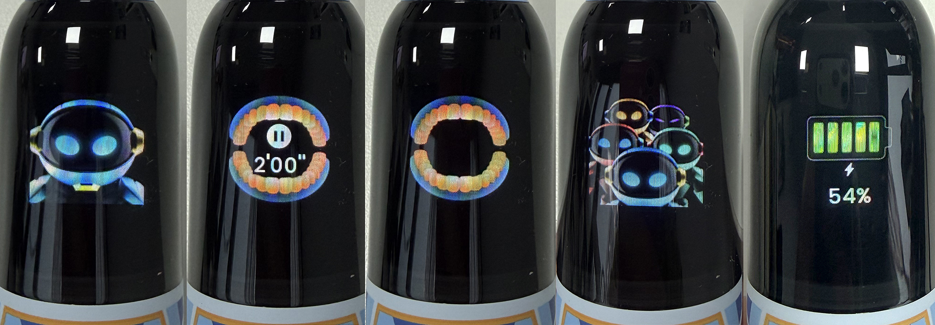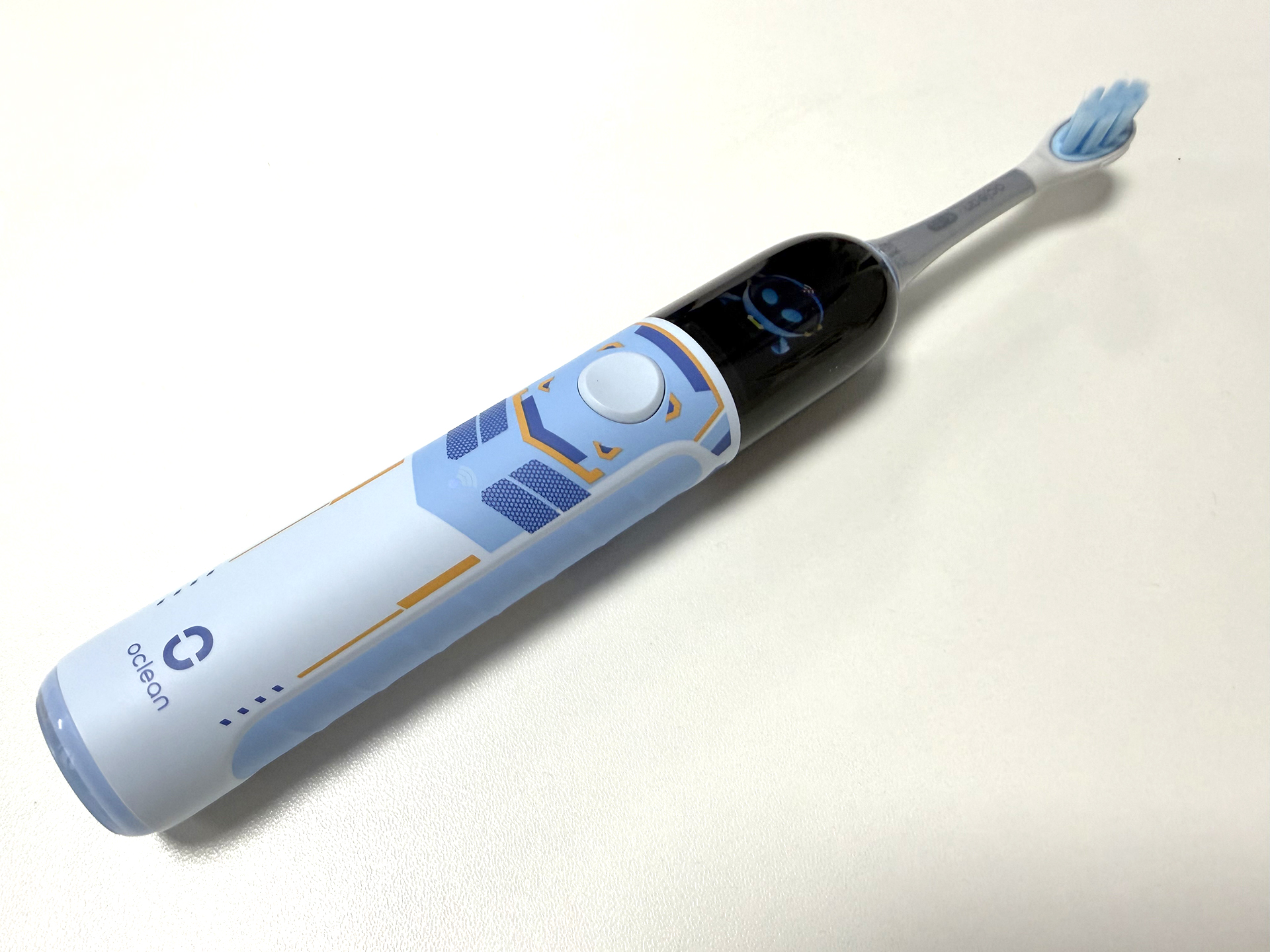 Внешность щётки футуристичная и напоминает инопланетный прибор, чему также способствует интерактивный экран с анимацией в виде забавных гуманоидов. Расцветки пластикового матового цилиндрического корпуса традиционные для двух гендеров — розовая и, как в нашем случае, голубая, а размеры чуть крупнее «взрослых собратьев», вероятно для того, чтобы у деток был комфортный хват.