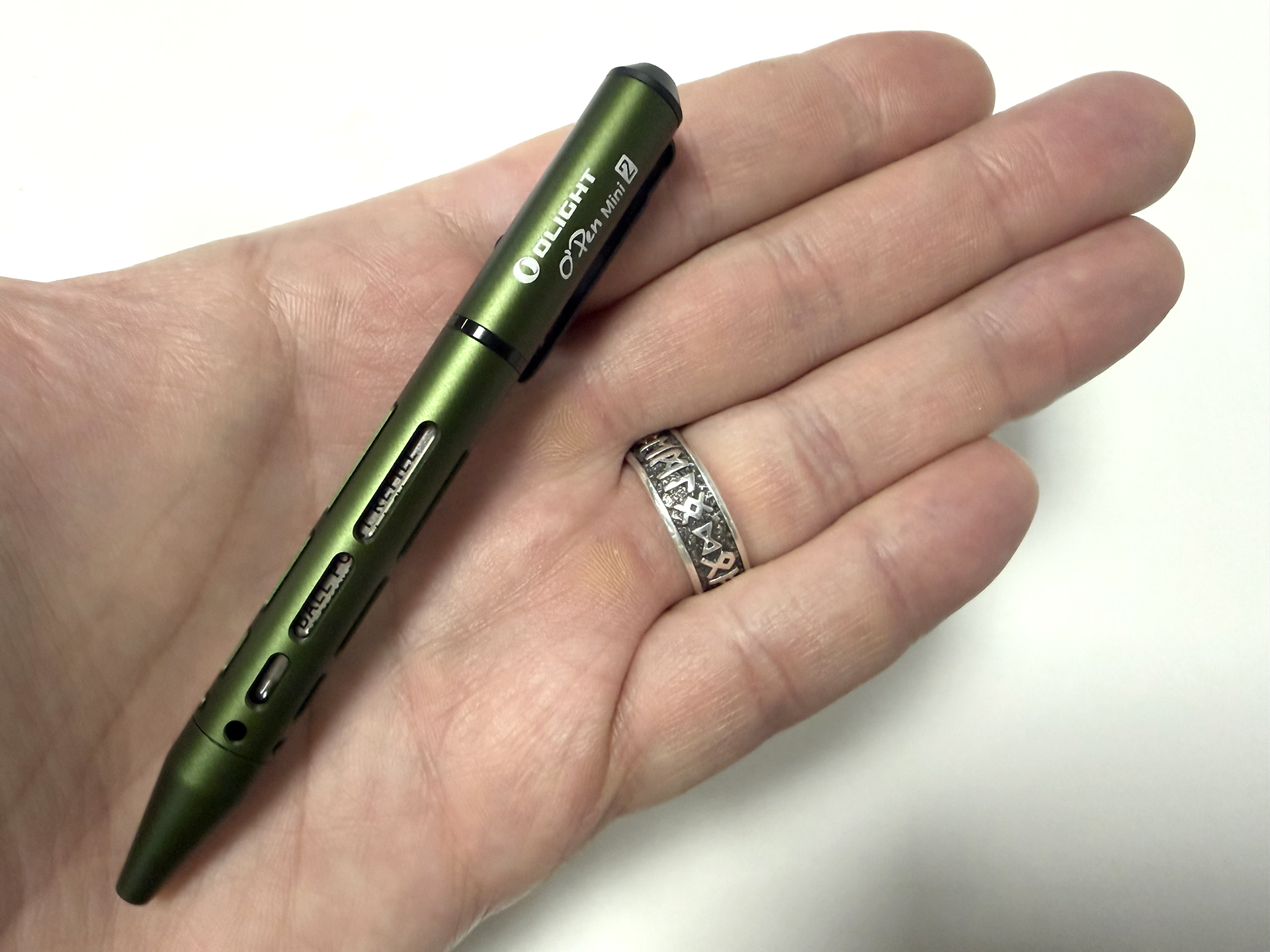 Olight O'Pen Mini 2 отличается от привычных писчих приборов по многим параметрам. Для начала она короче типичной ручки и это стоит учитывать при выборе (хотя вес приемлемый, 16г). Далее, скелетонизированный корпус из авиационного алюминия продольными прорезями напоминает дуло автомата, а механизм — затвор ☺️
