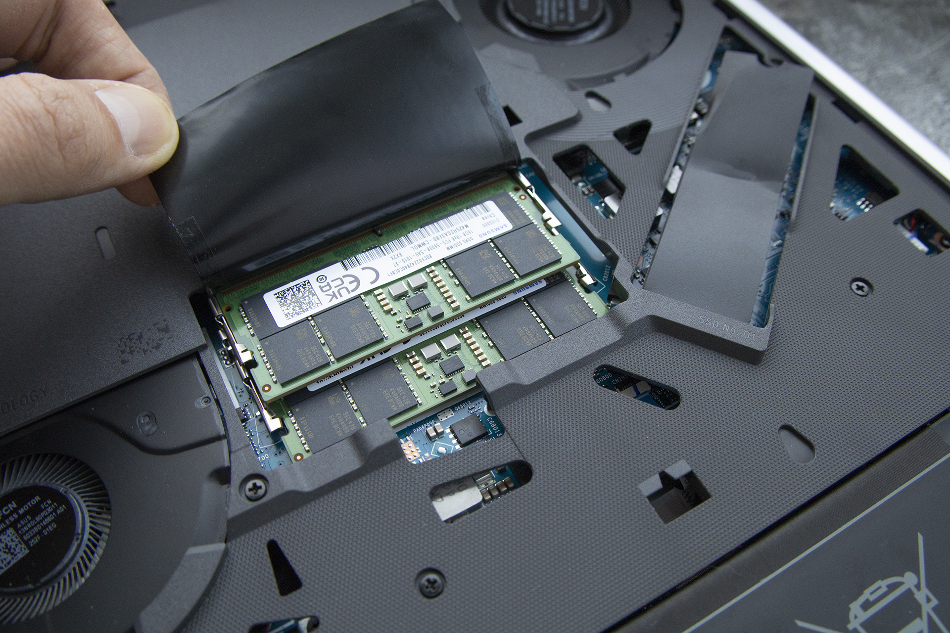 Нижняя часть — это светодиодная лента, окаймляющая заднюю крышку, ножки и большая решётчатая крышка, которую удерживает на месте защёлка под центральной нижней ножкой. Достаточно сдвинуть её в сторону, и вам откроются внутренности ноутбука — но частично: большая часть платы закрыта пластиковым защитным кожухом, вам же доступны три вентилятора, батарейный модуль и три слота под память. Первый слот, который рядом с маленьким вентилятором — это оперативная память, а в угловые слоты M.2 PCIe устанавливаются SSD, фиксирующиеся поворотными пластиковыми флажками. Удобно! Для увеличения памяти вам не нужны никакие инструменты!