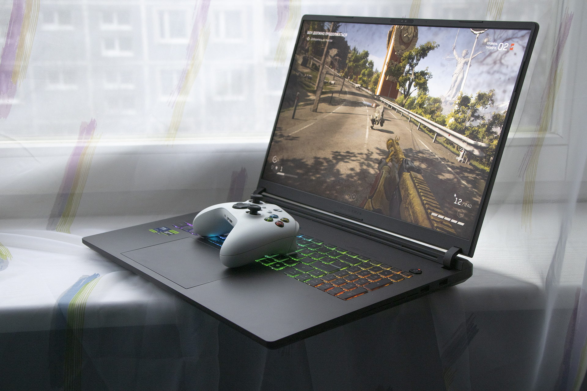 Во-первых, очень приятный тактильно корпус и поверхности: играть или набирать тексты на клавиатуре сплошное удовольствие, нажатие чёткое, комфортное, с адекватным усилием и точкой срабатывания. Во-вторых, экран с шикарной цветопередачей и достаточно глубоким чёрным, при этом сохраняется необходимая динамика в играх. Ну и в-третьих, мощности встроенного железа хватит, чтобы спокойно играть во все тяжёлые игры с «красивыми» настройками и более чем достаточным FPS. То есть, заявлено, что это мощный игровой ноутбук — это действительно мощный игровой ноутбук, который вполне может по впечатлениям потягаться с большим настольником, пусть и не в самой топовой конфигурации. И очень радует целостность устройства, оно воспринимается гармоничным и завершённым даже при условии своих габаритов и массы в 3.2 кг. Да, не очень-то он портативный, с собой таскать тяжело, далеко не в каждый рюкзак влезет. Но вот перемещать внутри квартиры или брать с собой на дачу, перевозя на транспорте — вполне!