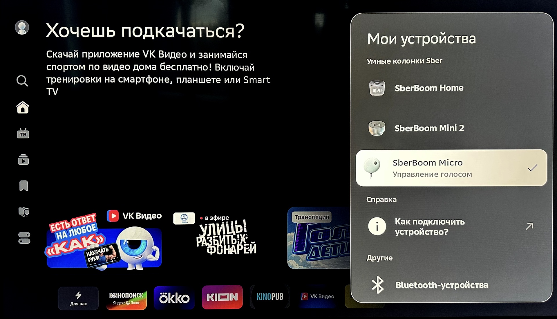 Связка с Салют ТВ или SberBox также тривиальна: SberBoom Micro появляется в списке доступных устройств в разделе Bluetooth и после его выбора вы сможете управлять телевизором, а также smart-приложениями непосредственно голосом без необходимости использовать ПДУ ☺️