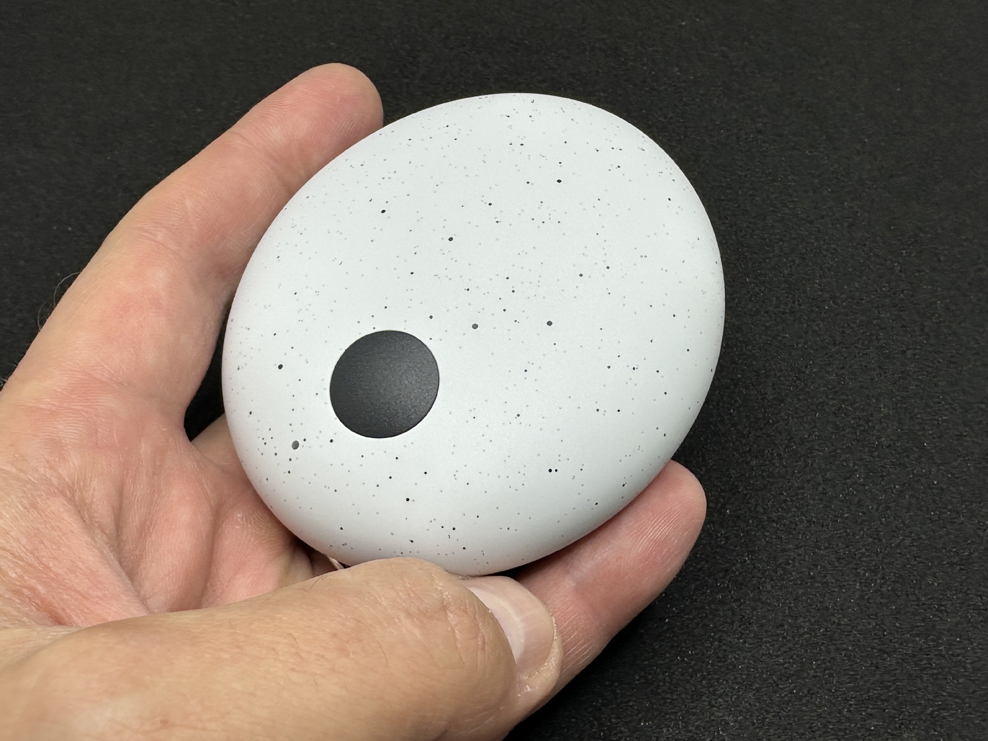 Внешний вид SberBoom Micro максимально необычный: пластиковый корпус колонки или точнее сказать системы напоминает овальный камень-голыш размером с ладонь и весом ~60г. Размеры гаджета настолько компактные, что изучая характеристики, невольно задумываешься, как такая мощь поместилась в столь крохотном корпусе?