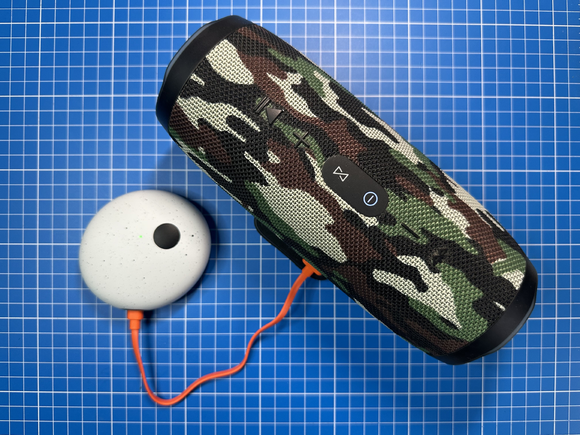 Элементов корпуса не так чтобы много: на верхней панели располагается чёрная механическая кнопка управления, которая в том числе отвечает за коннект, а вокруг неё расположены многоцветный индикатор состояния, незаметный в бездействии и микрофон. По контуру мы видим только углубление для кабеля питания со штекером USB-C, разъём в котором глубоко утоплен в корпус, а снизу — прорези динамика, бархотка крепежа и различные служебные символы.