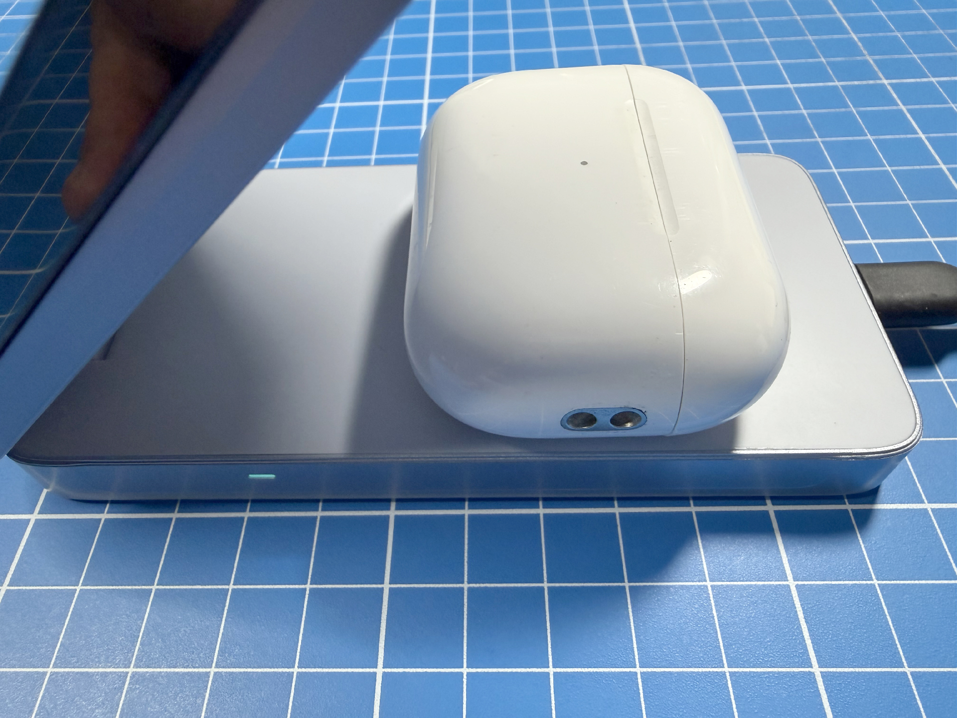 Элементов конструкции немного и доминанта здесь — верхняя панель аксессуара, окружность с магнитом и логотипом стандарта зарядки Qi 2.2, а с её обратной стороны имеется углубление, функционально никак себя не проявляющее в работе. В нижней же части расположилась «ванночка» для кейса наушников.